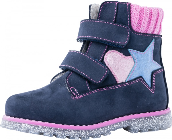 Удобные ботинки с подкладкой из байки с содержанием шерсти более 80% – отличный выбор для межсезонья. Утепленная подкладка сохраняет тепло. Верх выполнен из натурального нубука, по своей структуре похожего на замшу,благородного синего цвета, дополнен контрастной аппликацией в виде звезды и сердечка. Два ремня с липучкой позволяют не только быстро обувать и снимать обувь, но и обеспечивают плотное прилегание обуви к стопе. Мягкий трикотажный манжет создает комфорт при ходьбе и предотвращает натирание ножки ребенка. Дополнительную защиту от осенней прохлады придаёт войлочная стелька, которую можно вытащить для просушки, воспользовавшись специальной петлёй. Подошва клеевая, с небольшим каблучком, выполнена из прозрачного термоэластопласта с блёстками – легкого, прочного материала, обладающего отличным амортизирующим и теплосберегающим эффектом. Эта модель сочетает яркую, но благородную расцветку со стильным дизайном и удобством.Материал подошвы: ТЭП